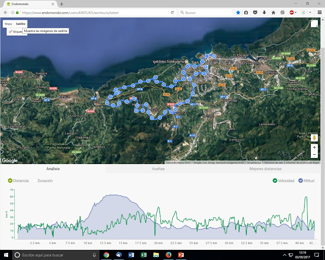Llegamos hasta el polígono Erratzu, en Urnieta y, tras atravesar el pueblo, tomamos la carretera que nos llevará a Lasarte-Oria y Zubieta. Paramos en en el bar Txiki-Erdi para que algunos se tomen un café y seguimos hacia Donostia por el bidegorri. En lugaritz me despido del grupo y por el vial llego a Amara y luego a casa. Son casi las 11:30 cuando me bajo de la bici en el portal tras 32 kilómetros de etapa. Mi avería ha condicionado el día...